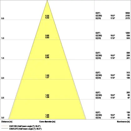 De lichtopbrengst en de gradenbundel spelen een grote rol. Zo geeft de lichtopbrengst van 680 Lumen in combinatie met de 36° stralingshoek deze inbouwspot een specifieke toepassing. Kort samengevat is een lichtintensiteit van maximaal 400 Lumen ideaal voor accentverlichting, terwijl hogere waardes goed gebruikt kunnen worden als basisverlichting. Over het algemeen geldt: hoe breder de gradenbundel, hoe geschikter deze is door basisverlichting. Dit komt doordat het licht over een groter oppervlak wordt verspreid. Smallere gradenbundels (tot 40°) kunnen echter bij hoge plafonds ook goed tot hun recht komen als algemene verlichting.